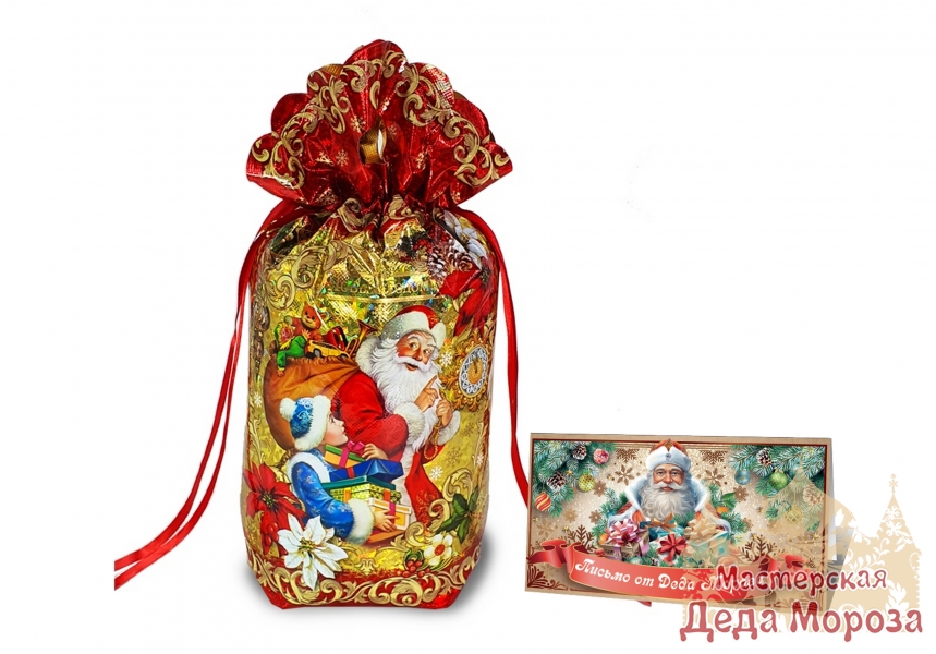 В новогодний подарок входит: Письмо от Деда Мороза, кондитерский набор, упаковка.