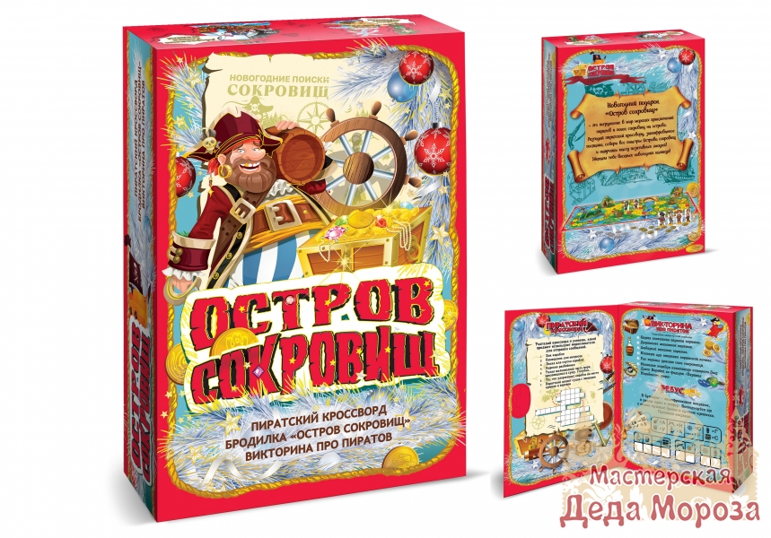 В новогодний подарок входит: Игра-бродилка "Остров сокровищ", кондитерский набор, упаковка.