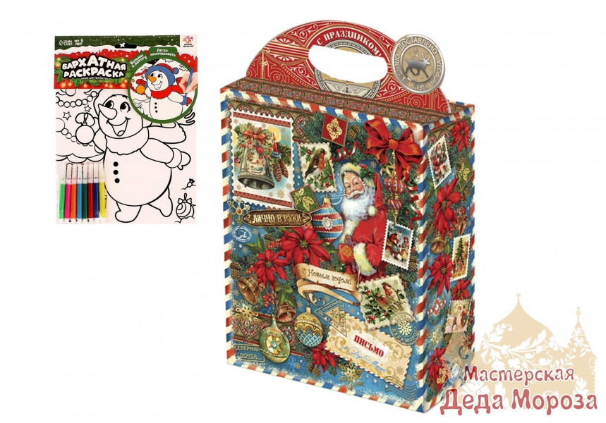 В новогодний подарок входит: Раскраска с фломастерами, кондитерский набор, упаковка.