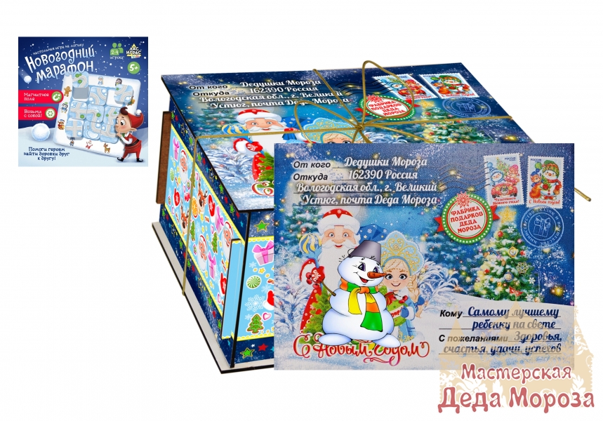 В новогодний подарок входит: Настольная игра на логику «Новогодний марафон», кондитерский набор, упаковка.