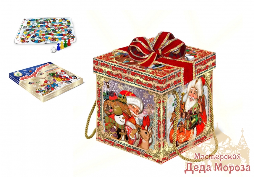 В новогодний подарок входит: Настольная игра-бродилка, кондитерский набор, упаковка.